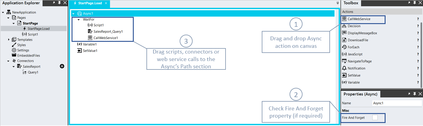 2. If you don't want your application's processing to wait for the Async's actions to complete before continuing, check the *Fire And Forget* property.